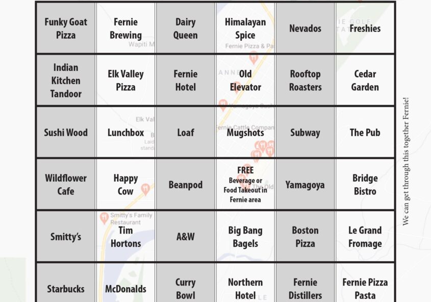 The Fernie Chamber of Commerce (in partnership with some passionate members) has launched a new campaign to help food & beverage businesses that have been impacted by the latest round of provincial health orders announced on Monday. The #FernieToGo bingo game features a bingo card with Fernie restaurants and bars offering take-out or delivery during…