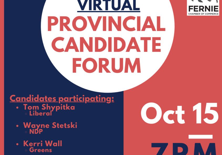 Elk Valley Provincial Candidate Forum Taking Place Virtually on Thursday 15 October The Fernie Chamber of Commerce is excited to be partnering with the Sparwood and Elkford Chambers of Commerce to co-host an Elk Valley Provincial Candidate Forum ahead of the BC provincial election. The forum will be held virtually as a Zoom webinar and…