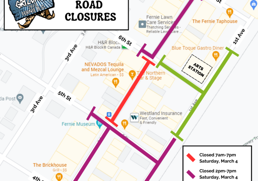 Road closures in downtown Fernie March 3rd – 5th for the 2023 Griz Days Festival