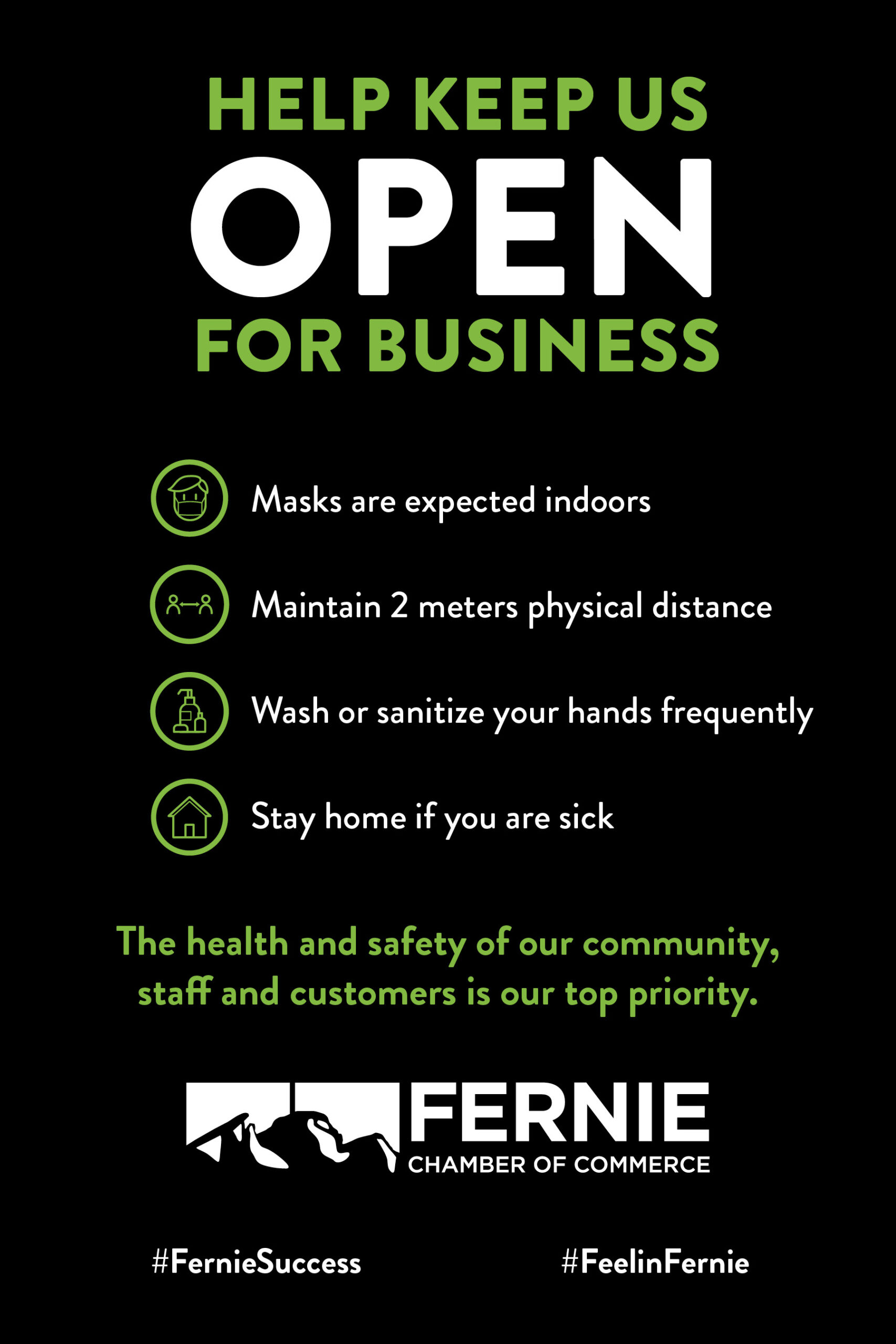The Fernie Chamber is launching a campaign this week to raise awareness locally of the continued need to follow public health advice related to the pandemic. The campaign will include new posters being distributed to all Fernie businesses to display in shopfronts, urging people to help keep local businesses open. This campaign will also be supported by messaging on social media and other Chamber communication channels.